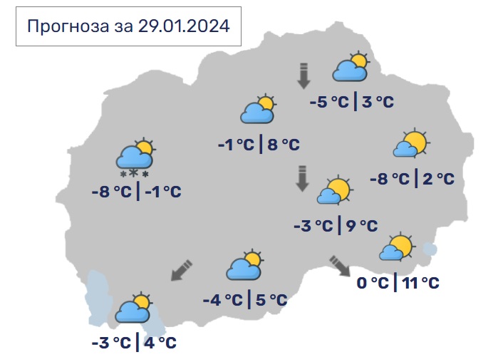 Утре времето наутро ќе биде студено со мала до умерена локална облачност, преку денот сончево. Ќе дува слаб до умерен ветер од северен правец, поизразен долж Повардарието.