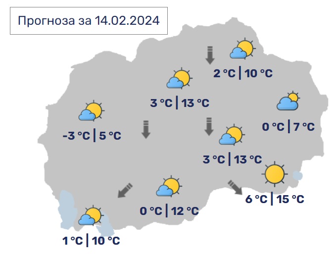Дневните температури ќе се движат од 6 до 16 Целзиусови степени.