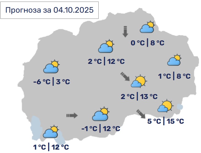 Во Скопје, времето ќе биде променливо облачно со сончеви периоди. Ќе дува слаб до умерен ветер од северен правец. Минималната температура ќе се спушти до 2, а максималната ќе достигне до 12 степени.