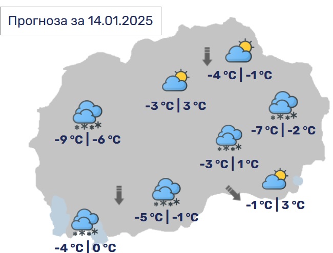 Според УХМР во наредните денови не очекува стабилно и студено време, со ниски утрински температури кои поради разведрувањето дополнително ќе опаднат и наместа ќе се спуштат под -10 степени.