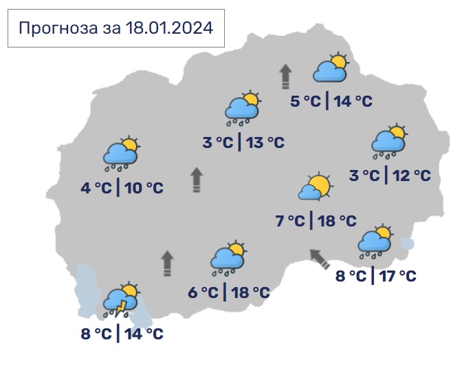 Во Скопје променливо облачно со повремен слаб дожд. Ќе дува слаб до умерен ветер од јужен правец. Минималната температура ќе се спушти до 3, а максималната ќе достигне 13 степени.