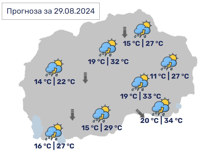 Во Скопје времето ќе биде променливо облачно и нестабилно, особено попладне кога во делови од котлината ќе има услови за појава на невреме со интензивен пороен дожд, силен ветер и град. Минималната температура ќе се спушти до 19, а максималната ќе достигне до 32 степена.