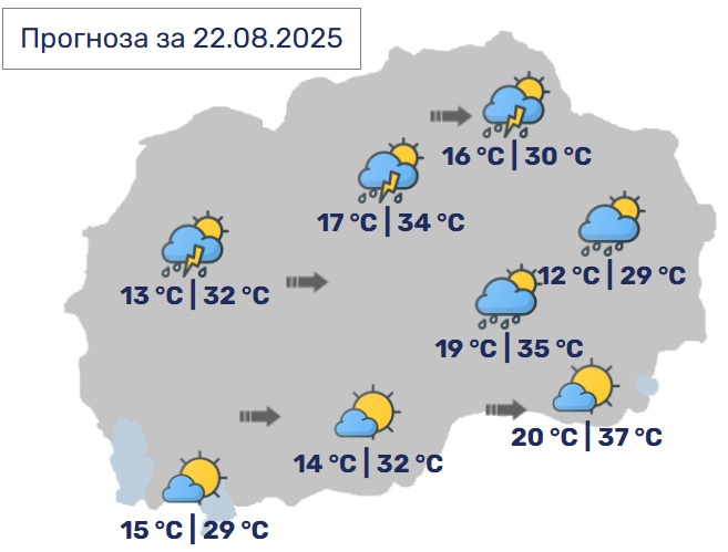 Утре времето ќе биде променливо облачно со сончеви периоди и температури до 33 Целзиусови степени. Попладне во западните делови ќе има повремен дожд. Ќе дува слаб до умерен северен ветер.
