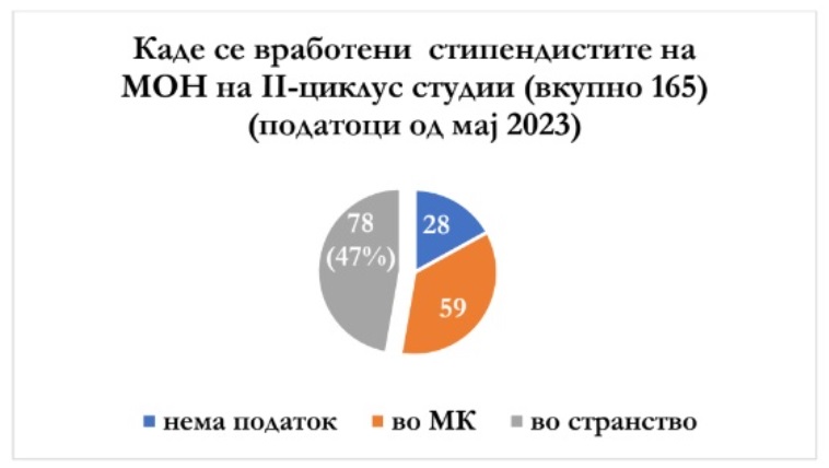 Проф. Мимоза Ристова презентирајќи ја анализата рече дека најчесто студирале (и останувале) во Велика Британија, САД, во земји на ЕУ, но и во Швајцарија и Израел. Од корисниците на стипендија за прв циклус, во земјава не се вратиле 67 отсто, а 48 отсто од тие со стипендија за магистерски студии, иако имале обврска да работат во државава, тоа не го сториле. За четиригодишни додипломски студии, рече Ристова, тоа се 160.000 евра.