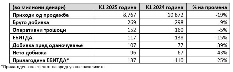 Бруто-добивката достигна 269 милиони денари, што претставува намалување од 9% споредено со истиот период минатата година. Добивката пред оданочување изнесува 107 милиони денари.