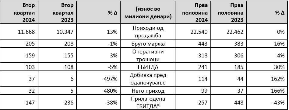Прилагодената ЕБИТДА во вториот квартал од 2024 година достигна 147 милиони денари со пад на годишно ниво предизвикан од повисоки оперативни расходи и пониска единечна маржа на домашниот пазар, поттикната од продажниот микс.