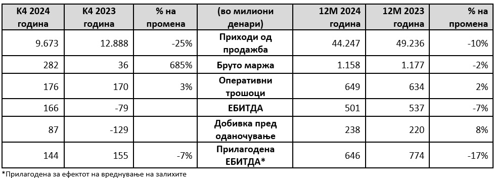 - Приходите од продажба изнесуваа 44.247 милиони денари во 2024, што е резултат на пониските остварени продажби на двата пазари. Приходите од продажба во четвртиот квартал 2024 година изнесуваа 9.673 милиони денари, 25% пониски од оние во истиот период минатата година.