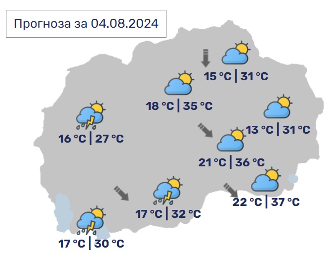 Во Скопје ќе биде сончево и топло со мала до умерена облачност со ветер од северен правец. Минималната температура ќе биде 18, а максималната ќе достигне до 35 Целзиусови степени.
