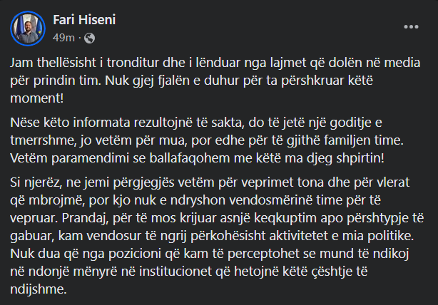 „Како луѓе, ние сме одговорни само за нашите сопствени постапки и вредностите за кои се залагаме, но тоа не ја менува мојата решеност да дејствувам. Затоа, за да не создадам некакво недоразбирање или погрешен впечаток, решив привремено да ги замрзнам моите политички активности. Не сакам од функцијата што ја имам да изгледа дека можам на кој било начин да влијаам врз институциите кои го истражуваат ова чувствително прашање. Цел мој живот сум активист за човекови права, борејќи се против неправдата и насилството. Не можам да бидам индиферентен, без разлика од каде потекнува сето ова. Исто така, во овие тешки моменти, понизно барам да се почитува приватноста на моето семејство. Ни треба простор за да се соочиме мирно со оваа ситуација, далеку од очите на јавноста“, напиша Хисени на својот фејсбук – профил.