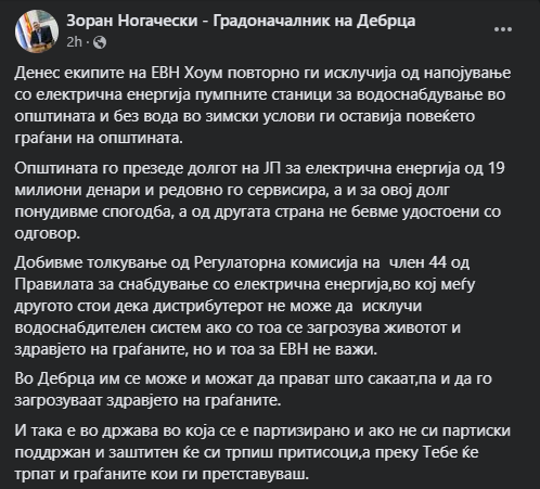 Како што истакна градоначалникот на Општина Дебрца, Зоран Ногачески, општината го презела долгот на Јавното претпријатие за електрична енергија од 19 милиони денари и истиот редовно го сервисира. Тој уште посочи дека и за новонастанатиот долг е понудена спогодба од страна на општина Дебрца, истиот да се исплаќа на рати, но оти од другата страна не добиле никаков одговор.