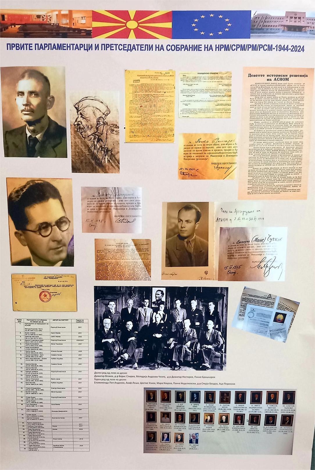 Централно место во поставката заземаат биографските податоци и изворен нагледен материјал за првите парламентарци и претседателите на Собранието од АСНОМ во 1944 па до 2024 година. Проектот ги претставува портретите, биографиите, времето и настаните што биле најрелевантни за периодот во кој тие работеле и дејствувале.