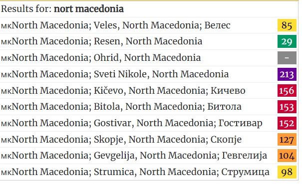 Загадено е во Скопје, но и во Кичево, Битола и Гостивар, па и Гевгелија. главниот град се наоѓа во портокаловата зона со категоризирање на воздухот како штетен за лицата со чувствително здравје и хронични заболувања.
