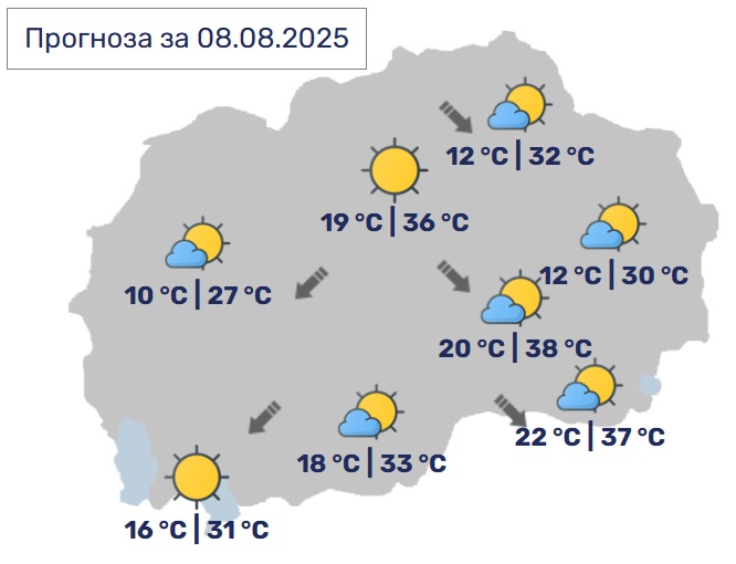 И во Скопје ќе биде сончево со мала до умерена облачност. Ќе дува слаб до умерен ветер од северен правец. Минималната температура ќе се спушти до 19, а максималната ќе достигне до 36 степени.