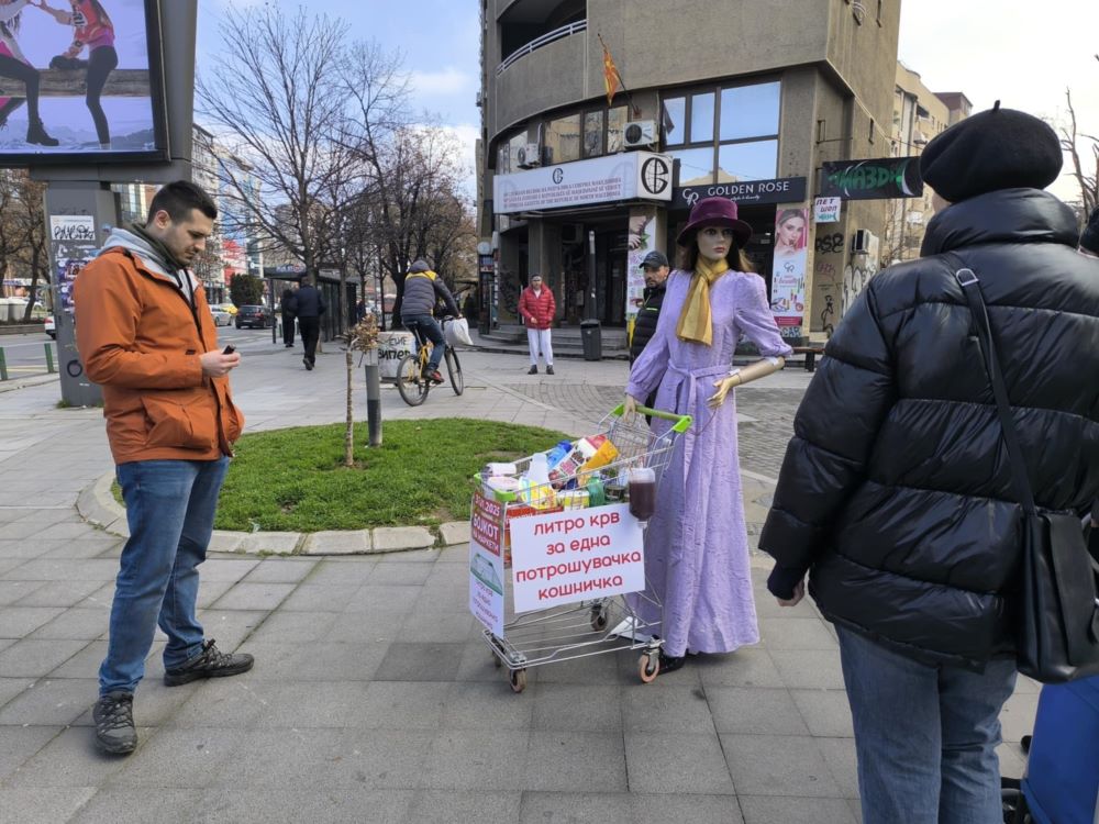 Екипата на Урбани уметнички акции – Урбана герила Скопје од Центарот за современа уметност од Скопје, денеска излезе со нова герила акција со наслов „Литро крв за потрошувачка кошничка“.