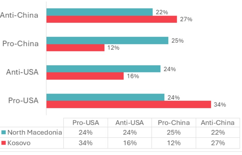 „Во Северна Македонија, медиумите задржаа поделен став за Кина, но покажаа зголемување на анти-САД. сентимент во рамките на тие дискусии поврзани со Кина. Ова сугерира дека како што глобалните тензии (како ривалството САД-Кина) се интензивираа или станаа понагласени, некои македонски медиуми се удвоија во спротивставувањето на двете сили. Про-кинеската содржина остана силна, како и содржината против Кина – што укажува на тековната внатрешна дебата – но аспектот на критикување на САД кога зборуваат за Кина стана поизразен. Темите поврзани со Кина почнаа да служат како уште еден фронт во наративната битка САД против Кина на македонско тло. Ова е во согласност со поширокиот ‘ефект на Трамп’ забележан на друго место“, се наведува во истражувањето.