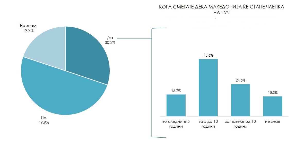 Нешто помалку од една третина од испитаниците (30,2%) сметаат дека Македонија ќе стане членка на ЕУ, додека половина или 49,9% сметаат дека Македонија нема да стане членка на ЕУ.