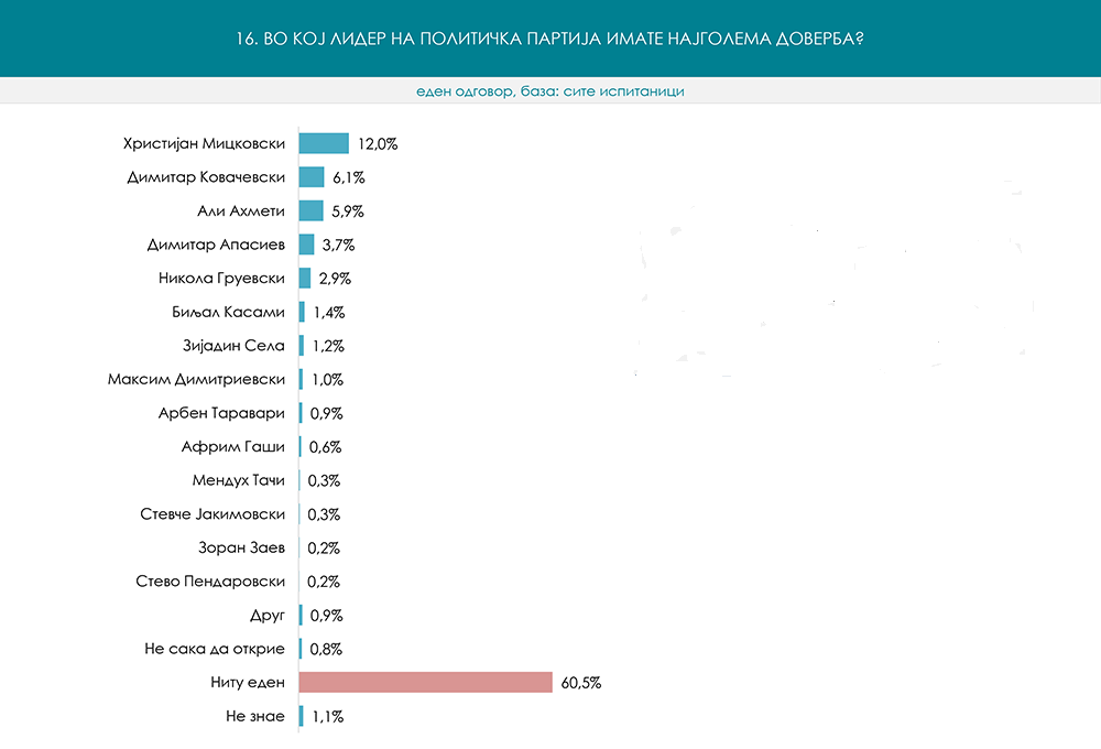 Приближно две третини или 60,5% од испитаниците немаат доверба во ниту еден лидер на политичка партија на македонската политичка сцена. Додека од оние кои се изјасниле, во Христијан Мицкоски, лидерот на ВМРО-ДПМНЕ, доверба имаат 12%, во Димитар Ковачевски 6,1%, Али Ахмети 5,9%, во Димитар Апасиев 3,7%, во Никола Груевски 2,9% од испитаниците…