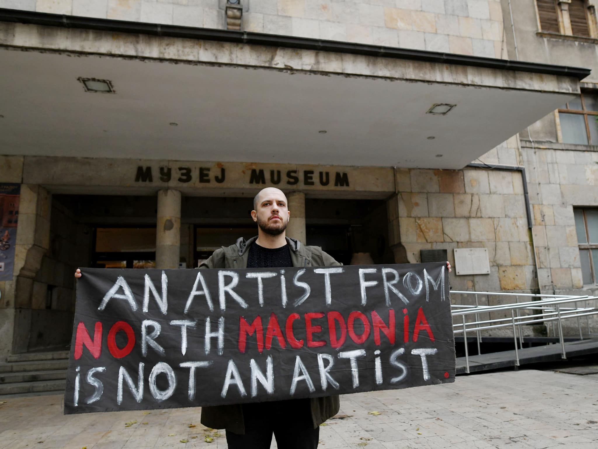 „Почитувани пријатели, познаници, непријатели, и најважно доследни на основните човекови принципи како правото на слободно изразување. Цензурата од страна на Музеј на град Скопје која ја најавив пред еден месец, утре официјално ќе се случи. Запомнете го 28-ми ноември како црн ден за македонската култура и уметност, ден кога се цензурираше уметникот во Македонија. Иако никого лично не повредувам во содржината на моето дело, истото беше забрането со манипулативни оправдувања од типот: ќе ги повредиш колегите во музеј, овака ќе направиш кога ќе се менува политиката, па дури и се впуштија во обид да прават корекција на делото. Епа… тешко е да се зборува за оваа тема, но уште потешко е да се премолчи кога ти прават очигледна цензура! Испровоциран од пораките отидов во музејот да ги прашам вработените дали ги повредувам со делото кое го цензурираше т.н кураторка? Одговорот на сите беше ова е срамота, ова е вукојебина, ова може да ти го прават само нечесни луѓе кои не си ја сакаат Македонија. Е, сега, дали се слушаме кураторке? Просторот кој од позиција на моќ го користите за да глумите авторитет нема да ви биде даден. Јас и сите граѓани на Република Македонија го плаќаме тој музеј. Немој да се криете, појавете се на дебата, бранете ги вашите будалаштини јавно, не од глувчешка дупка како што сте биле цел живот. Едно знам срамот ќе ве прогонува до крајот на животот. Нека му е со среќа изложбата на сите уметници. Македонија е бесмртна!“