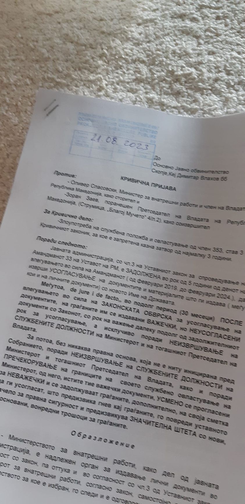„Почитувани, денеска, до ОЈО поднесов кривична пријава против министерот О. Спасовски и поранешниот претседател на Владата З. Заев, за кривичното дело злоупотреба на службената положба и овластување (чл 353 ст.3 од КЗ) поради неизвршување на своите службени должности за усогласување на документите од страна јавната администрација (меѓу кои и на личните документи на граѓаните). Против Спасовски кривичната пријава се однесува и на пречекорување на службените должности извршени спротивно на правниот систем, со негово усмено прогласување за неважечки на издадени важечки документи согласно законите за лични документи во рокот од 5-те години, во кој јавната администрација била должна да ги усогласи, а поради нивна вина тоа не го сторила. Со ова е предизвикана значителна материјална штета за граѓаните, покрај другите штети по здравјето, уставното начело за правна сигурност…итн. Господ на помош!“