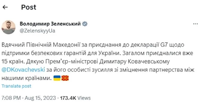 „Благодарен сум ѝ на Северна Македонија што се приклучи кон декларацијата на Г-7 за поддршка на безбедносните гаранции за Украина и стана 15-та земја што го стори тоа. Ги ценам личните напори на премиерот Димитар Ковачевски за зајакнување на партнерството на нашите земји“, објави Зеленски на Твитер.