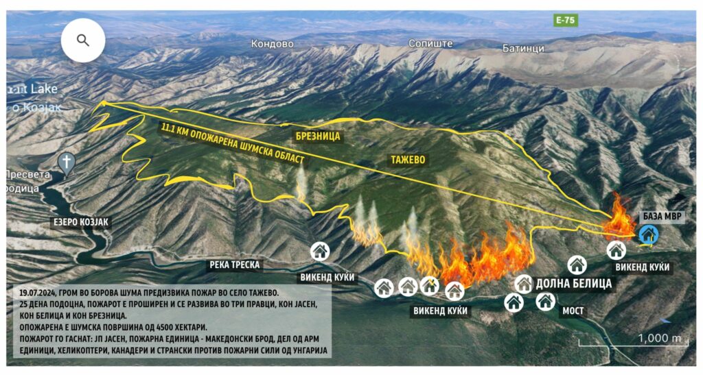 Опожарена е борова шума на територија од 4.500 хектари. За целиот овој период од речиси 30 дена тука интервенираа воздухоплови, и хеликоптери и ер трактори, како и пожарникари, доброволци, војници и полицајци. Тимот од 46 пожарникари дојдени со специјална опрема од Унгарија главно беа ангажирани на овој терен.