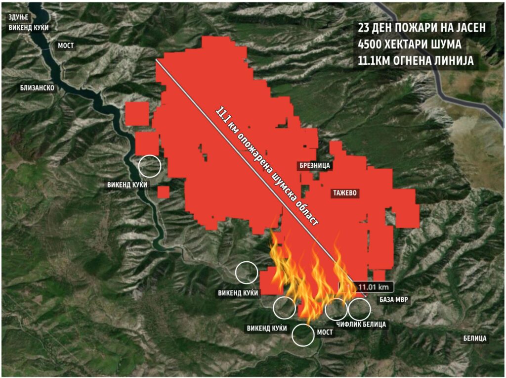 Овој пожар гори веќе 23 дена и досега изгоре околу 4.500 хектари шума, а линијата на огнениот фронт е 11,1 километар.