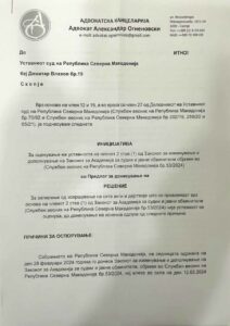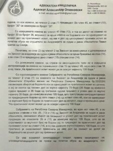 „Во Академијата тие што сакаат да се вработат како слушатели за идни судии, треба да полагаат и практичен испит за кој пред законските измени беа предвидени вкупно 100 бодови (70 бода од писмениот дел и 30 бода од усмениот дел). Со законските измени (Сл.весник бр.53/2024), за да се зголеми уделот на субјективниот фактор во бодувањето, неспособните министер Кренар и заменичката Мадиќ, предложија, а пратениците од СДСМ и ДУИ изгласаа, да се добиваат 35 бода од усмениот дел на испитот. И сега Законот за Академија за судии има контрадикторен чл.45 кој во ставовите 9 и 13 пропишува 105 бодови од полагањето на практичниот испит, а ставот 14 на истиот член императивно наведува дека на практичниот испит можат да се освојат најмногу 100 бода. Ова со право на секој кандидат за слушател во Академијата ќе му даде основ за покренување на тужба поради погрешно и нееднакво пресметување на аритметичкиот збир на бодовите и утврдувањето на конечната оценка кај секој кандидат одделно и ситуација од носење на одлуки за поништување на јавниот оглас и постапката за вработување на слушателите во Академијата за судии и обвинители“, рече Огненовски.