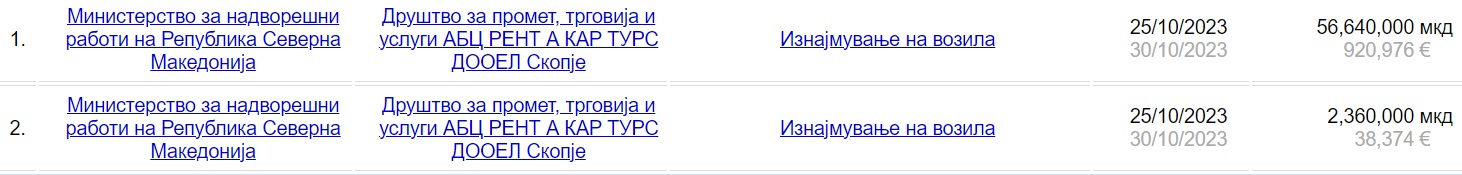 Првиот договро е потпишан на 56.640.000 денари или околу 920 илјади евра за четири месеци. Вториот договор е на сума од 2.360.000 денари или околу 38 илјади евра за период од една година за редовни потреби на МНР.