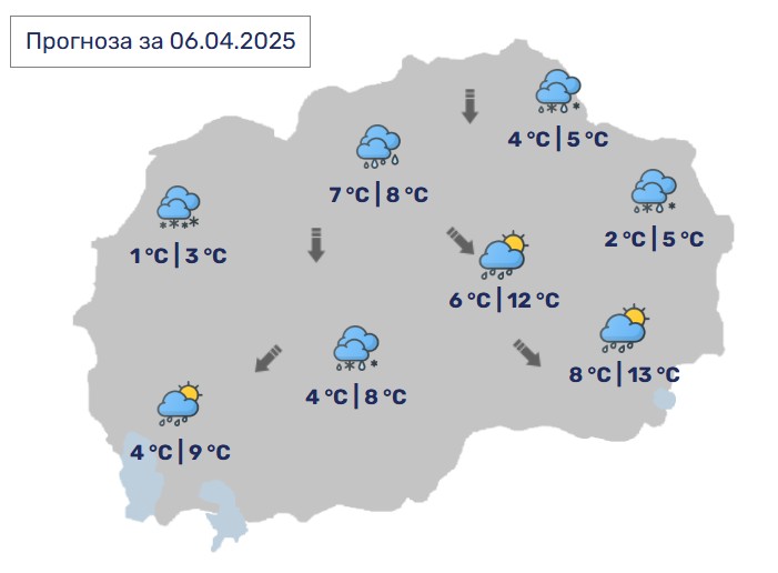 Во Скопје, претежно облачно и студено со врнежи од дожд. Кон крајот на денот во повисоките делови од котлината врнежите ќе бидат од дожд и снег. Ќе дува умерен до засилен северен ветер. Минималната температура ќе се спушти до 7, а максималната ќе достигне до 8 степени.