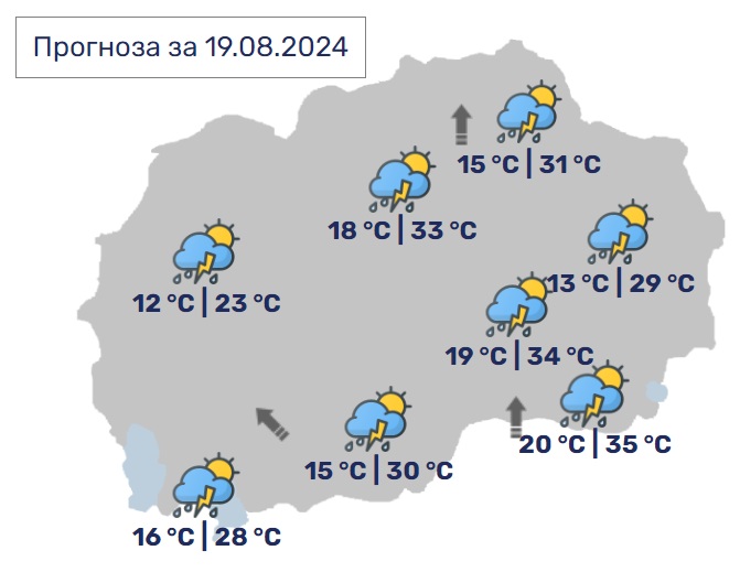 Во Скопје претпладне умерено облачно, попладне и во вечерните часови ќе биде нестабилно со пороен дожд и грмежи, а во делови од котлината ќе има услови за појава на невреме. Минималната температура ќе се спушти до 18, а максималната ќе достигне до 33 Целзиусови степени.