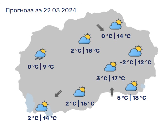 Дневните температури ќе се движат од 13 до 18 Целзиусови степени.