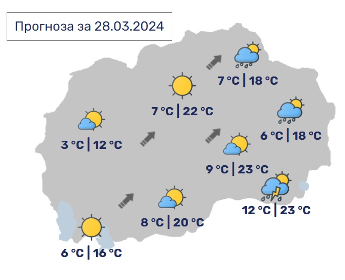Во Скопје претпладне променливо облачно со врнежи од дожд, во делови од котлината со услови за појава на ретки грмежи. Попладне сончево со мала облачност. Ќе дува умерен, повремено засилен ветер од југозападен правец.