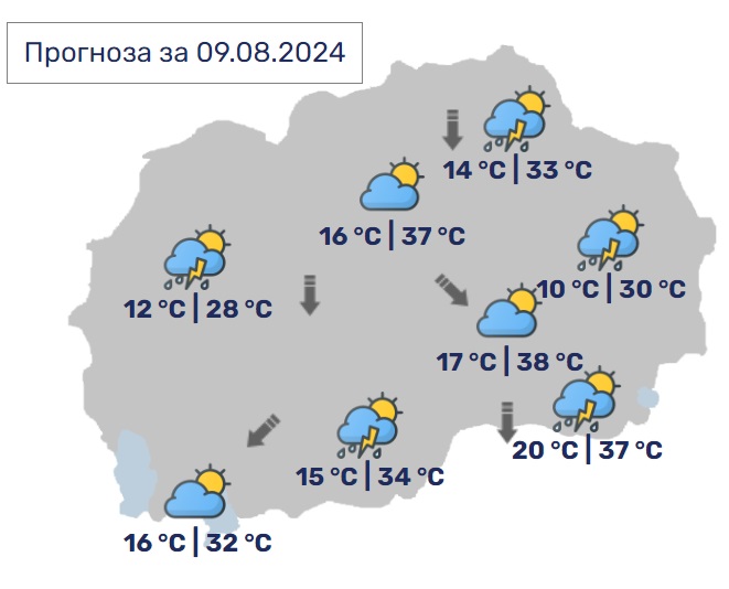 Во Скопје ќе биде сончево и топло со мала до умерена облачност. Ќе дува слаб до умерен ветер од северен правец. Минималната температура ќе се спушти до 16, а максималната ќе достигне 37 степени.