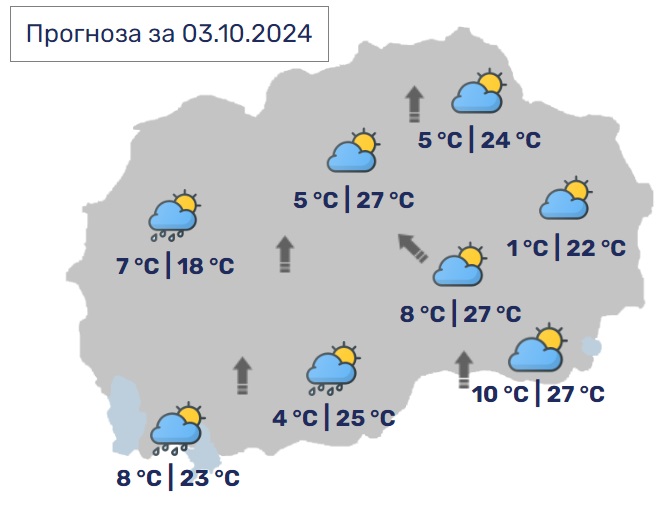 Во Скопје ќе биде сончево со умерена облачност, која кон крајот на денот ќе се зголеми. Ќе дува умерен, а во делови од котлината повремено засилен ветер од југоисточен правец. Минималната температура ќе се спушти до 5, а максималната ќе достигне до 27 степени Целзиусови.