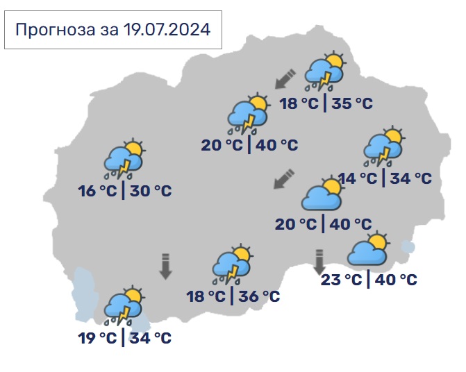 Во Скопје времето ќе биде сончево и многу топло време со мала до умерена облачност. Попладне во делови од котлината ќе биде нестабилно со пороен дожд, грмежи, засилен ветер и услови за појава на краткотрајно невреме со град.