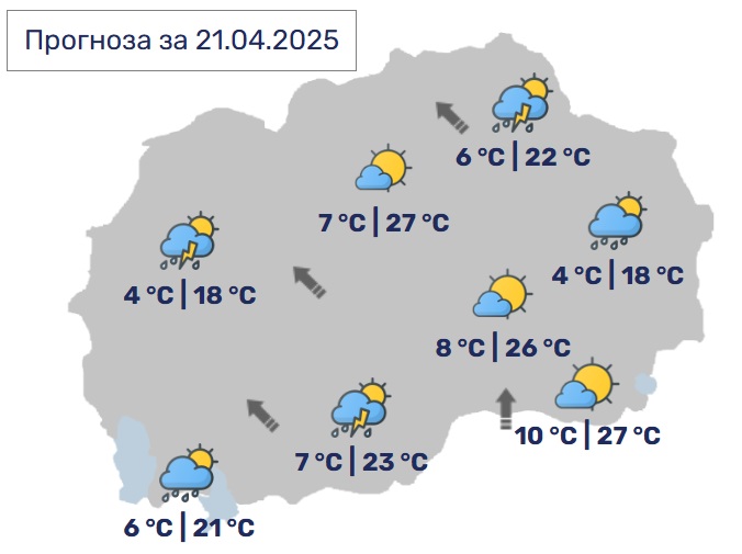 Утре претпладне времето ќе биде сончево со умерена облачност. Попладне наместа ќе биде нестабилно со локален дожд и грмежи. Ќе дува слаб до умерен ветер од југоисточен правец. Минималната температура ќе се движи од 7 до 12, а максималната од 19 до 26 Целзиусови степени.