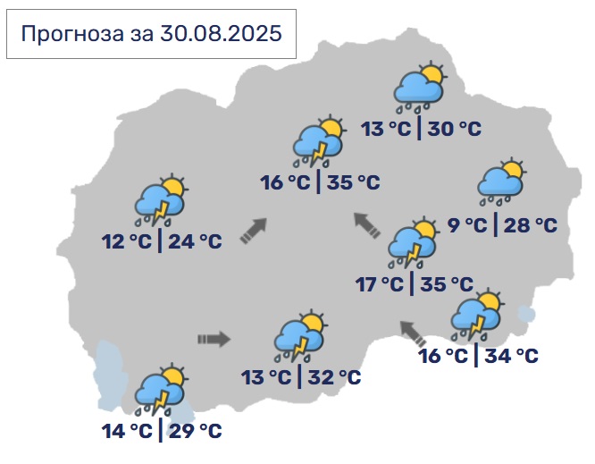 Во Скопје, времето ќе биде променливо облачно и нестабилно со локален пороен дожд и грмежи. Ќе дува умерен до засилен ветер од југоисточен правец.