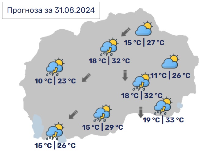 Утре времето ќе биде сончево со мала до умерена облачност и со слаб до умерен ветер од северен правец. Попладне во планинските подрачја ќе има услови за краткотраен пороен дожд и ретки грмежи. Дневните температури ќе се движат од 27 до 34 Целзиусови степени.