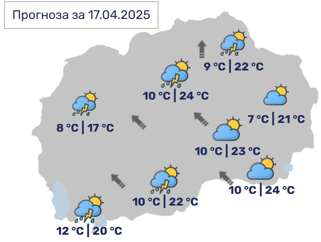 Утре времето ќе биде променливо облачно со локални врнежи од дожд, наместа поројни, проследени со појава на грмежи, особено претпладне. Ќе дува слаб до умерен ветер од југозападен правец. Минималната температура ќе се движи од 8 до 13, а максималната од 17 до 22 Целзиусови степени.