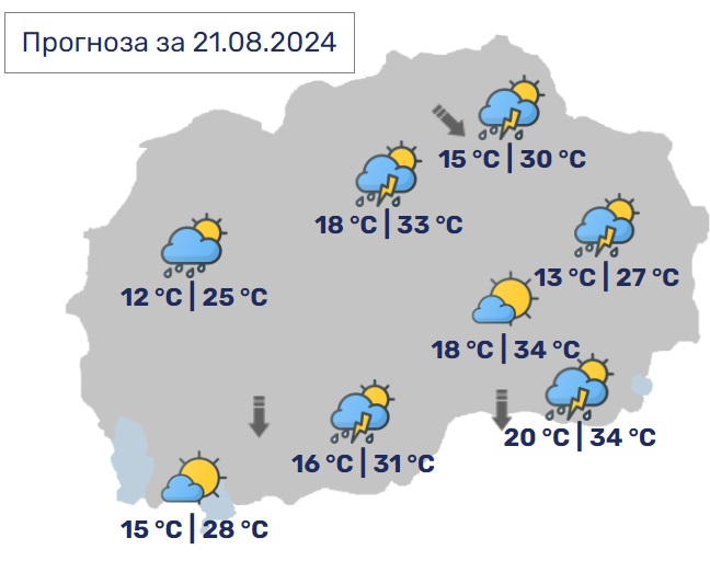 Во Скопје ќе биде сончево со умерена облачност и со слаб до умерен северен ветер. Попладне ќе има услови за краткотраен пороен дожд и грмежи. Минималната температура ќе се спушти до 18, а максималната ќе достигне до 33 степени.