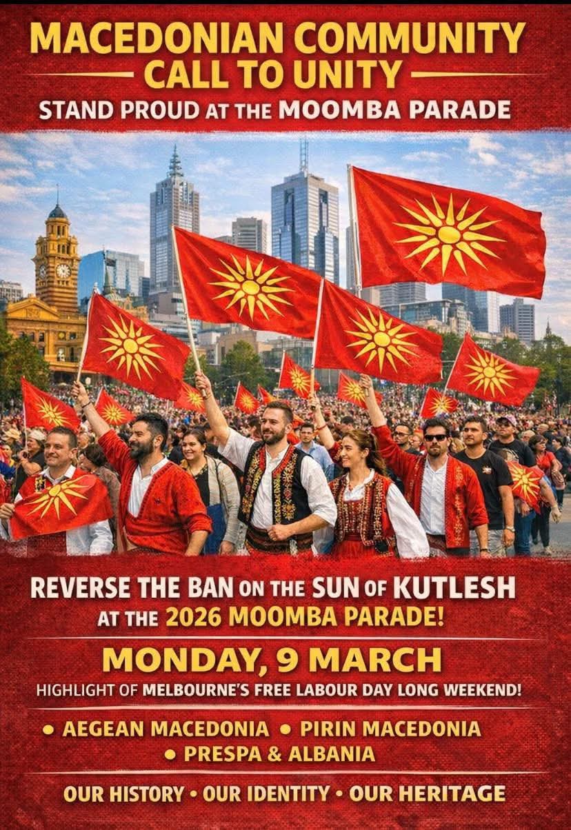 Имено, годинава, организаторот на парадата Мумба, Градот Мелбурн им наложил со директива на македонските учесници да го користат исклучиво државното знаме на Македонија. Сепак, како што истакнува Ицо Најдовски – Перин, активен протагонист на македонската заедница во Мелбурн, Македонците во Австралија, етнички повеќе се идентификуваат со знамето со „сонцето од Кутлеш (Вергина)“.