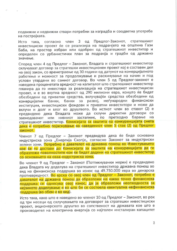 Исто така, од КЗК бараат „давателот на државната помош“, односно Владата, „во Известувањето кое ќе го достави до Комисијата за заштита на конкуренцијата да ги образложи поволностите кои ќе бидат дадени на стратешкиот инвеститор“ за формирање на индустриската зона „Енергија Скопје“, што е поместено во членот 7 од предложениот законски текст.