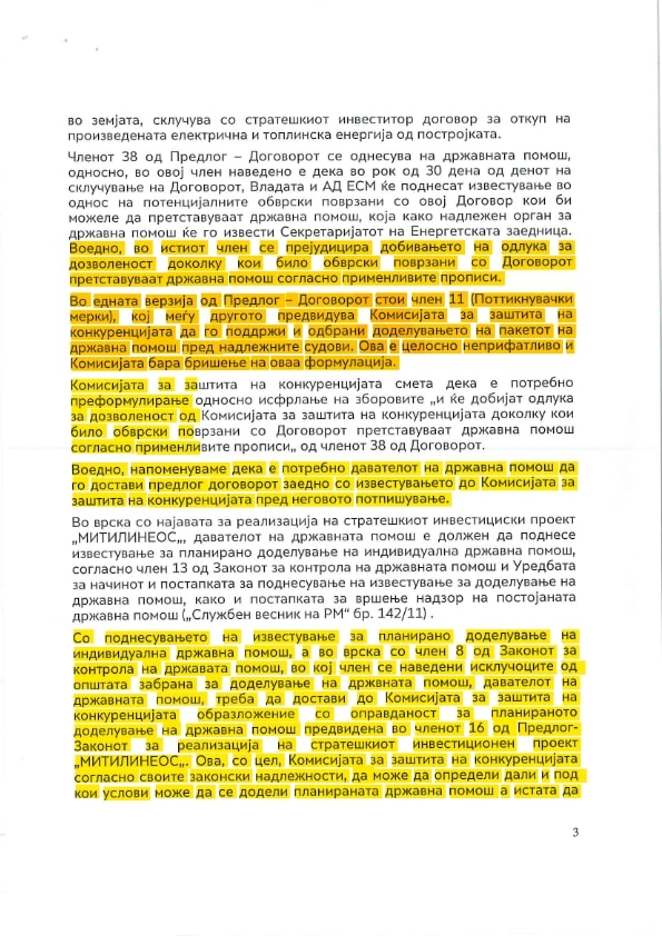 „Со поднесувањето на известување за планирано доделување на индивидуална државна помош, а во врска со член 8 од Законот за контрола на државата помош, во кој член се наведени исклучоците од општата забрана за доделување на држаната помош, давателот на државната помош, треба да достави до Комисијата за заштита на конкуренцијата образложение CO оправданост за планираното доделување на државна помош предвидена во членот 16 од Предлог- законот за реализација на стратешкиот инвестиционен проект ‘Митилинеос’… Ова, со цел, Комисијата за заштита на конкуренцијата согласно своите законски надлежности, да може да определи дали и под кои услови може да се додели планираната државна помош, а истата да биде согласно член 8 став (2) од Законот за контрола на државната помош“.