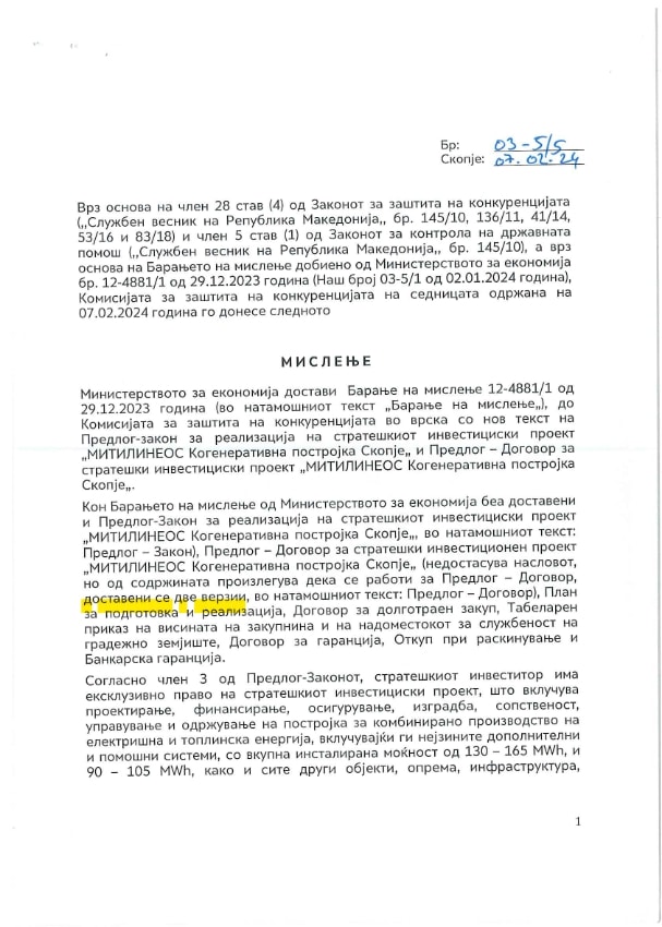 Комисијата за заштита на конкуренцијата нема позитивно мислење за предложените закон и договор кои се однесуваат на стратешкиот инвестициски проект што треба да го реализира грчки Митилинеос. Мислење од КЗК побарале од Министерството за економија (на 29 декември лани), при што меѓу сите документи доставени на увид, се и две верзии на предлог-договорот за когенеративната постројка Скопје.