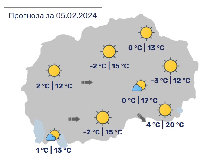 И утре времето ќе биде сончево и натпросечно топло со мала локална облачност. Ќе дува слаб до умерен ветер од југозападен правец.