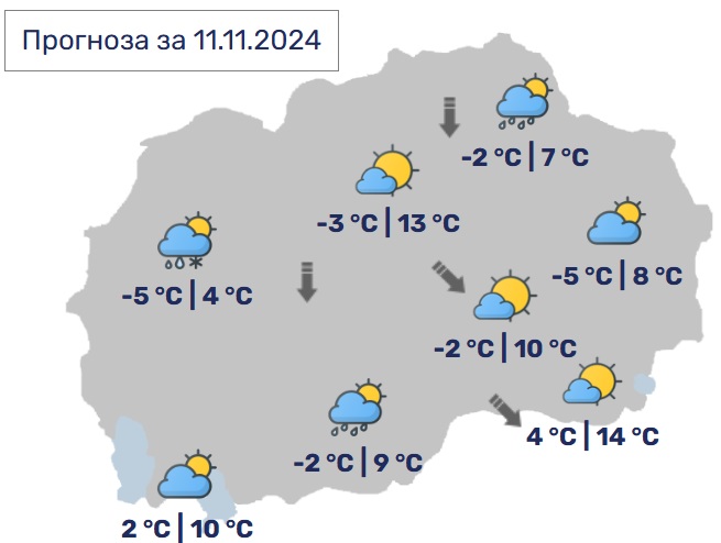 Утре наутро понекаде ќе има врнежи од слаб дожд, а на планините слаб снег. Преку денот променливо облачно со сончеви периоди. Ќе дува слаб до умерен ветер од северен правец. Минималната температура ќе се движи од -2 до 5, а дневната од 7 до 15 Целзиусови степени.