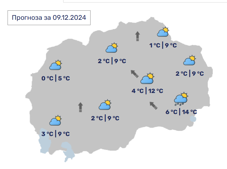 Во Скопје ќе биде променливо облачно, претпладне со појава на магла. Ќе дува слаб до умерен ветер од јужен правец. Минималната температура ќе се спушти до 2, а максималната ќе достигне 9 степени.