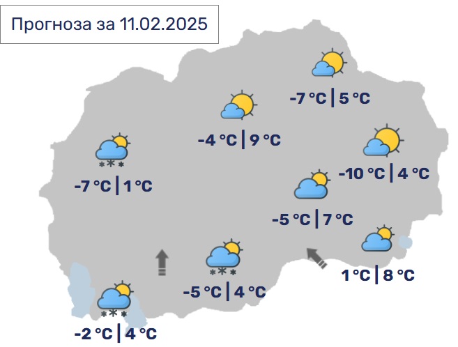 Утрe наутро времето ќе биде студено со температури од -7 до 2 Целзиусови степени. Преку денот времето ќе биде умерено до значително облачно. Од запад ќе започне повремен снег особено во планините, а во останатите делови ќе има услови за провејување на слаб локален снег. Ќе дува слаб до умерен ветер од југоисточен правец. Максималната температура ќе се движи од 2 до 8 Целзиусови степени.