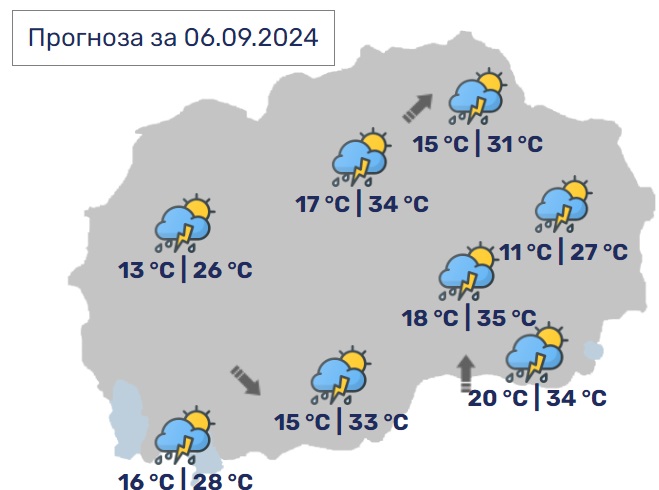 Следува период на променливо облачно време на повеќе места со пороен дожд и грмежи. Процесите повремено ќе бидат поинтензивни и наместа ќе има појава на невреме со интензивен пороен дожд, грмежи, засилен ветер и појава на град. Дневните температури ќе бидат во постепено опаѓање.