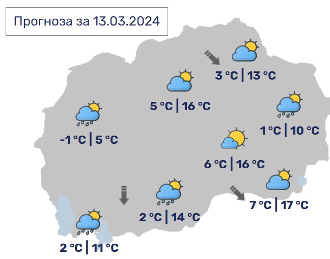 Во Скопје променливо облачно со услови за краткотраен дожд и со слаб до умерен ветер од северозападен правец. Минималната температура ќе се спушти до 7, а максималната ќе достигне 16 степени.